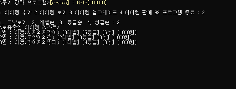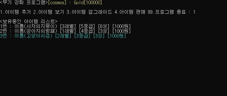 printf("1.아이템 추가 2.아이템 보기 3.아이템 업그레이드 4.아이템 판매 99.프로그램 종료 : ");